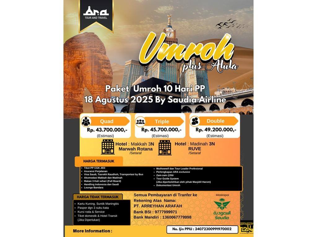 - Harga dan program sewaktu-waktu bisa berubah sesuai regulasi Arab Saudi dan Indonesia